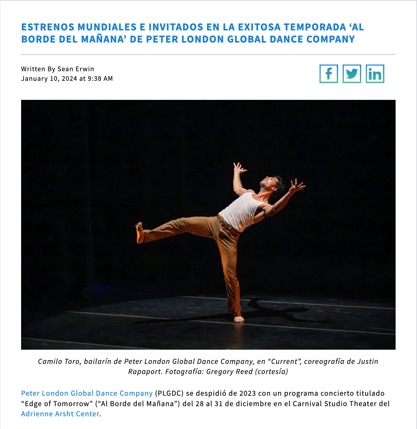 ESTRENOS MUNDIALES E INVITADOS EN LA EXITOSA TEMPORADA ‘AL BORDE DEL MAÑANA’ DE PETER LONDON GLOBAL DANCE COMPANY Read more To read this article in English, click here. Tetyana BoklachJanuary 25, 2024Comment Facebook0 Twitter LinkedIn0 Reddit Tumblr Pinterest0 0 Likes